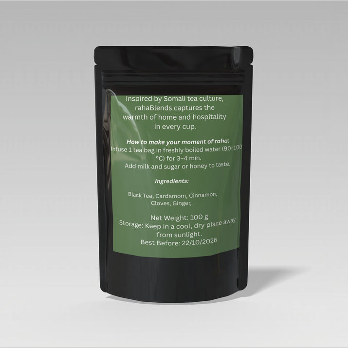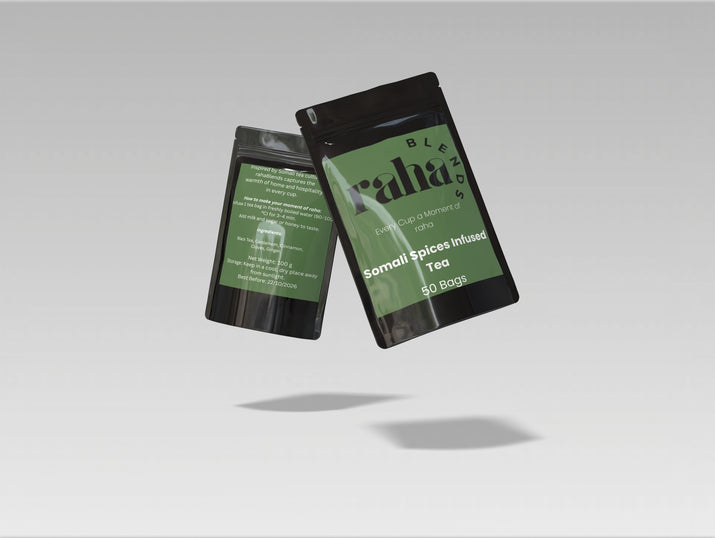 Calm your mind and awaken your senses with the smooth, aromatic warmth of rahaBlends Somali Spices Infused Tea. A balanced fusion of hand-selected spices that delivers comfort, clarity, and calm — brewed in just minutes.